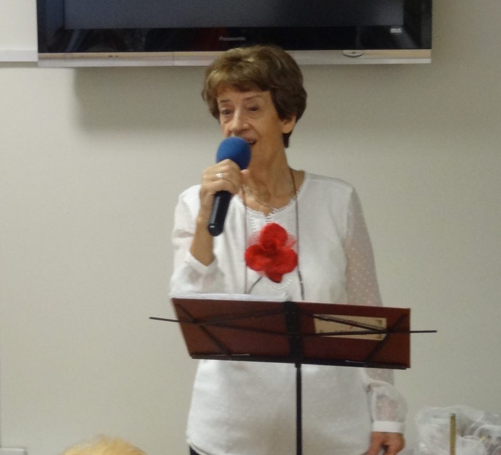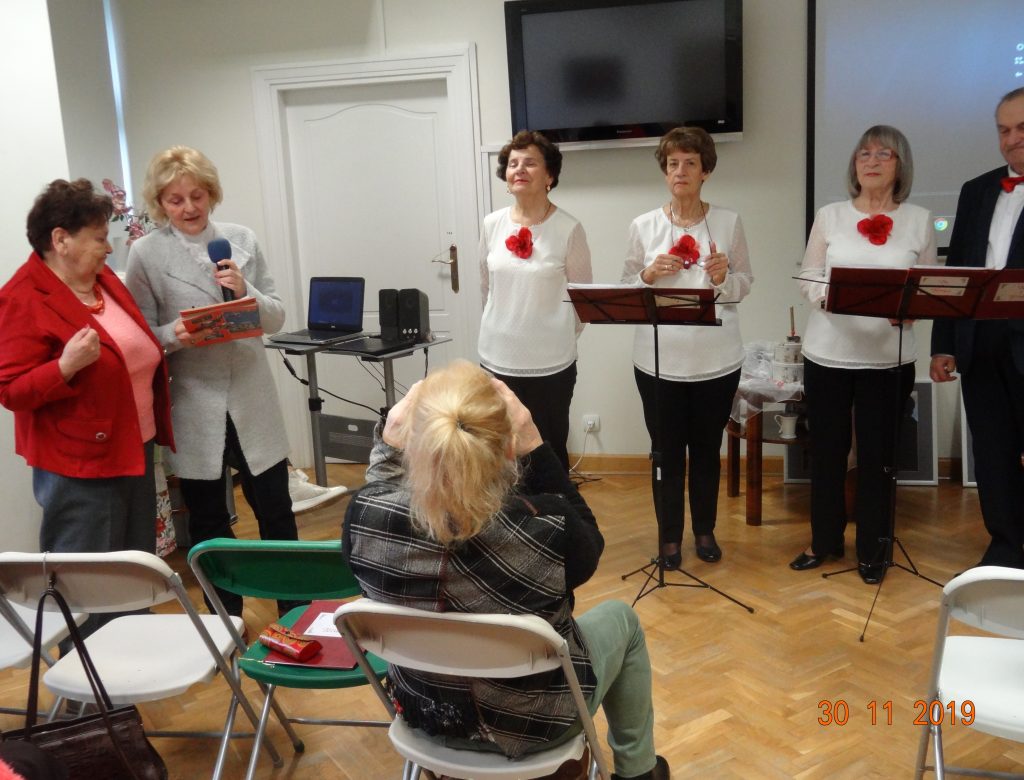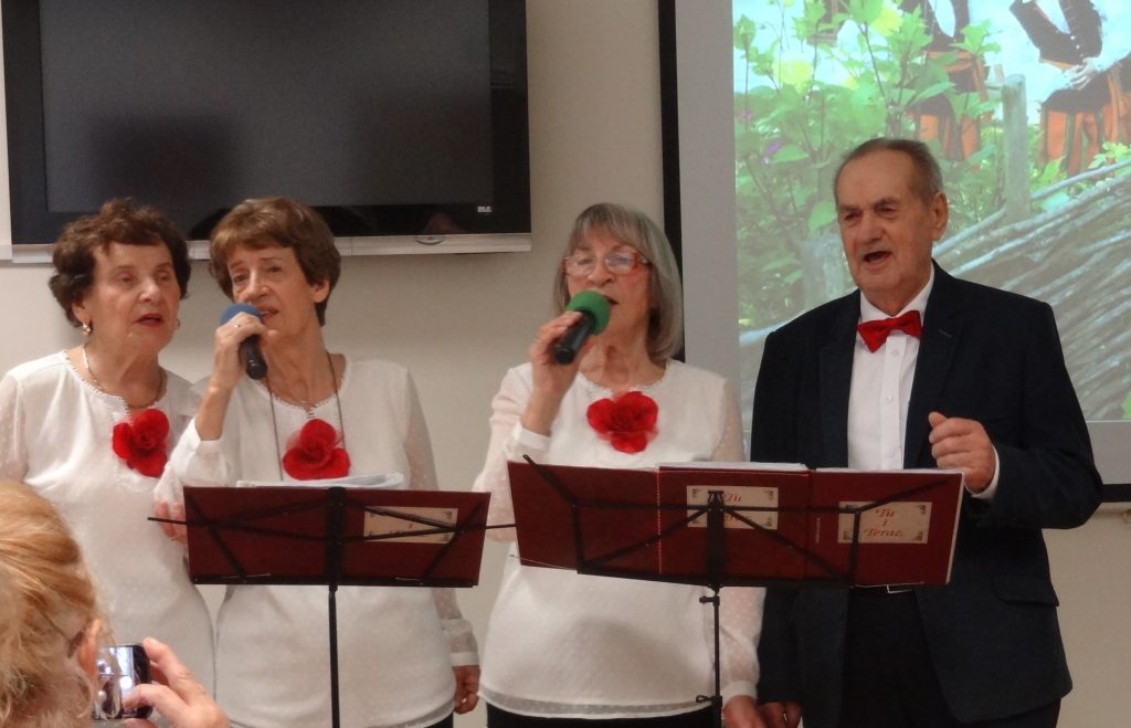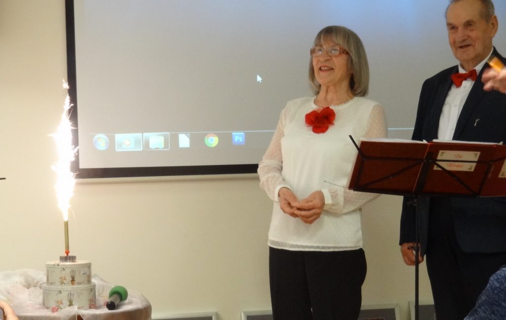 Dwa tygodnie temu, Grażyna z chórem garnizonowym wzięła udział w uroczystościach wręczenia sztandarów jednostkom Wojska Polskiego na Wawelu w Krakowie przez Prezydenta RP i oprawy chóralnej tej imprezy oraz spotkania z Parą Prezydencką, o czym nam opowiedziała skromnie, ale z zadowoleniem. Po tych podziękowaniach dla Zespołu „Tu i teraz” od Zarządu ŚUTW i obecnych klubowiczów na Sali i całej braci słuchaczy uniwersytetu. Nastąpiły wyróżnienia ze strony Kierującej Zespołem-osób z poza śpiewających: kubeczkami z wizerunkiem członków Zespołu wręczono je Bożence Kwapińskiej, Basi Olszowy, Bogusi Matachowskiej, sopranistce i panu przygotowującemu podkłady muzyczne do akompaniamentu zespołowi. Była też niespodzianka – tort jubileuszowy z fajerwerkiem i słodki poczęstunek dla obecnych na sali.