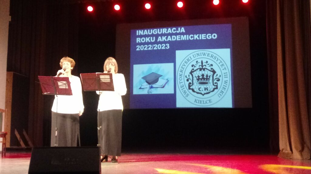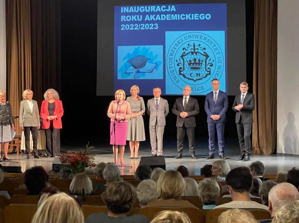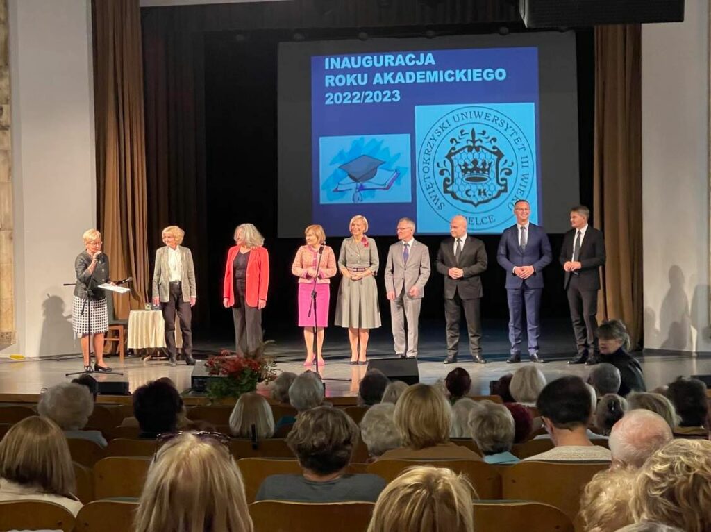 w dniu 10.10.2022. W tym ważnym dla nas wydarzeniu wzięli udział także honorowi goście: wiceminister Sportu i Kultury Anna Krupka, wicemarszałek woj. świętokrzyskiego Renata Janik, senator Krzysztof Słoń, prorektor Politechniki Świętokrzyskiej prof. Artur Maciąg, dziekan Wyższej Szkoły Ekonomii, Prawa, Nauk Medycznych im. prof. E.Lipińskiego dr Łukasz Boratyński, prezes Głównego Urzędu Miar prof. Jacek Semaniak. z-ca dyrektora Regionalnego Ośrodka Polityki Społecznej Arkadiusz Ślipikowski. Z okazji inauguracji roku akademickiego , złożyli słuchaczom ŚUTW życzenia ciekawych zajęć , realizowania zamierzeń, na które wcześniej nie mieli czasu i zachęcali do aktywności społecznej i ruchowej.