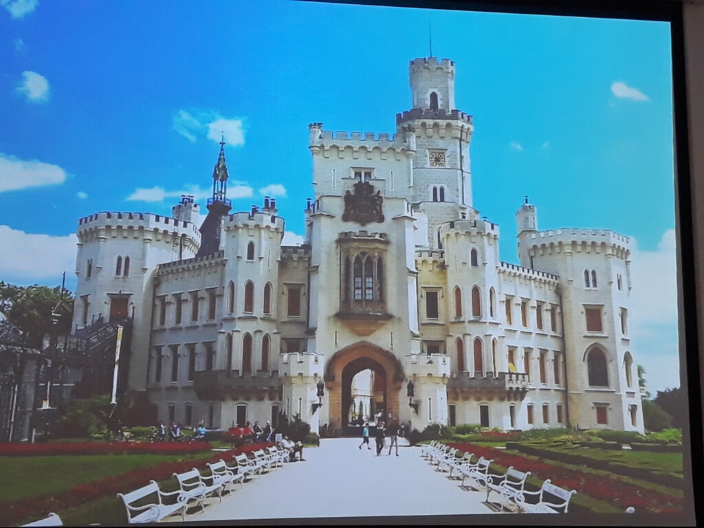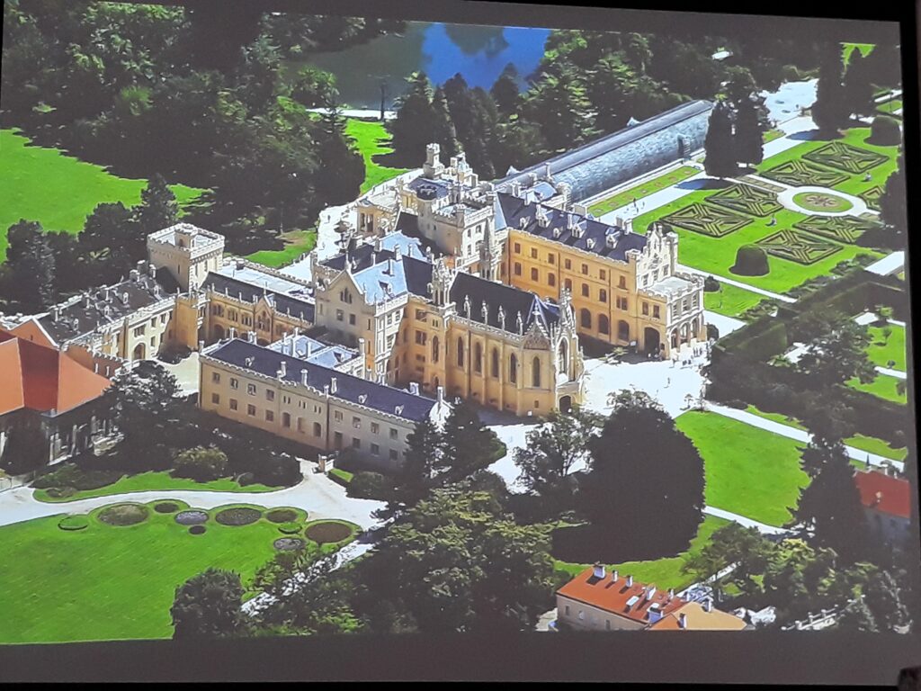 a także mimo zmian ustrojowych, kiedy to często zamieniano pałace i dwory na budynki użyteczności publicznej, które potem ulegały zniszczeniu. W Czechach jest też duża liczba kościołów, które jako zabytki utrzymywane są w dobrym stanie mimo niskiej religijności Czechów. Ponieważ Czechy przez wieki były związane z królewskim rodem Habsburgów , wiele więc zamków i pałaców związanych z tą właśnie dynastią pozostało jeszcze na terenie Czech . I te zabytki pokazał nam w swojej prelekcji pan Krzysztof Myśliński. Oglądaliśmy zdjęcia pięknych pałaców a prelegent omawiał pokazywane nam obrazy, przybliżał ich pochodzenie i historię. Pierwszym pałacem, który zobaczyliśmy był pałac „Mikulov” – największy w Europie kompleks pałacowy