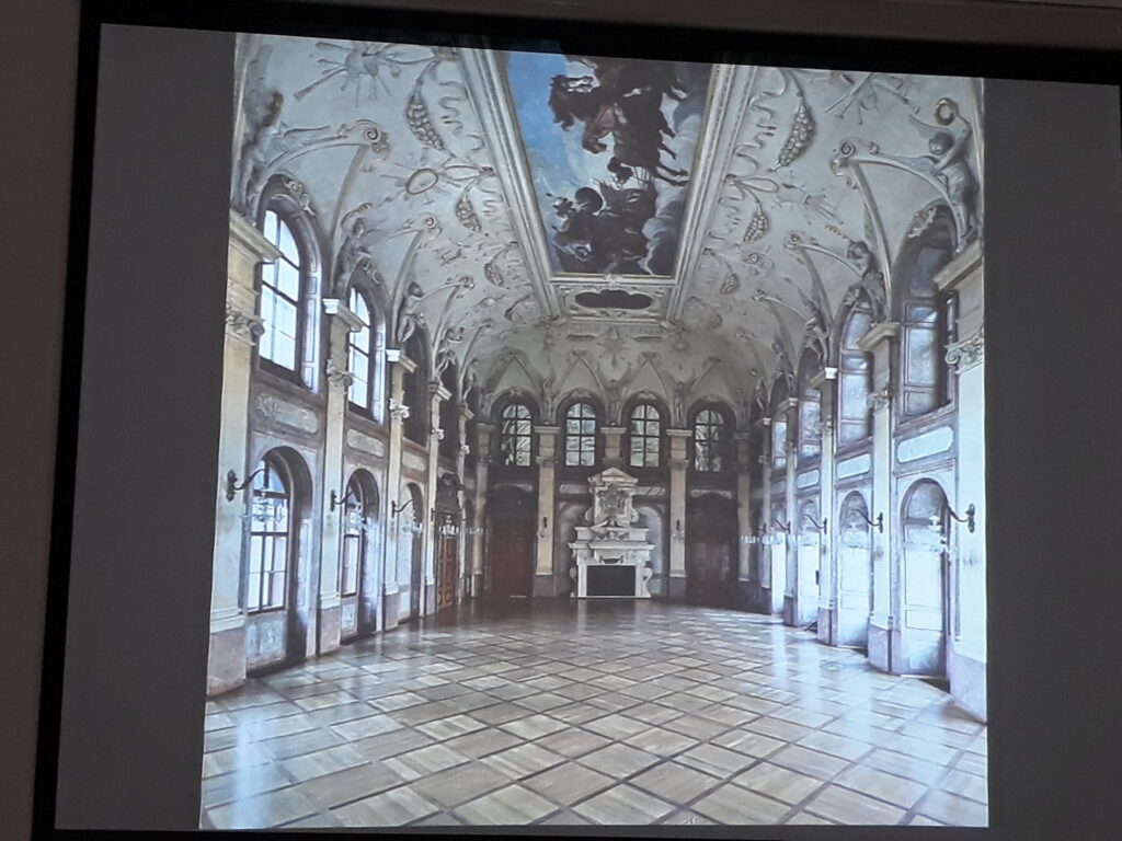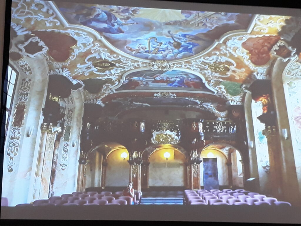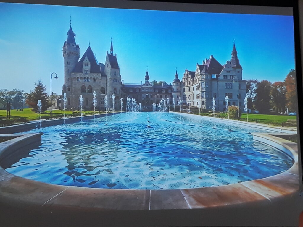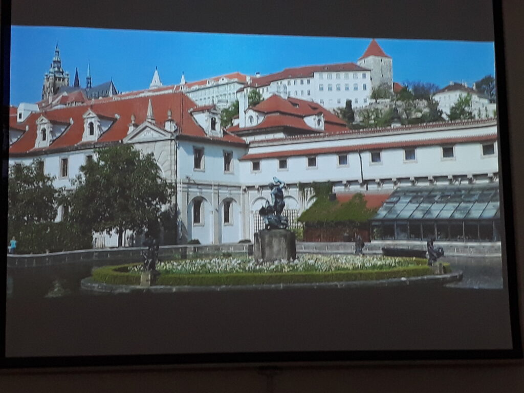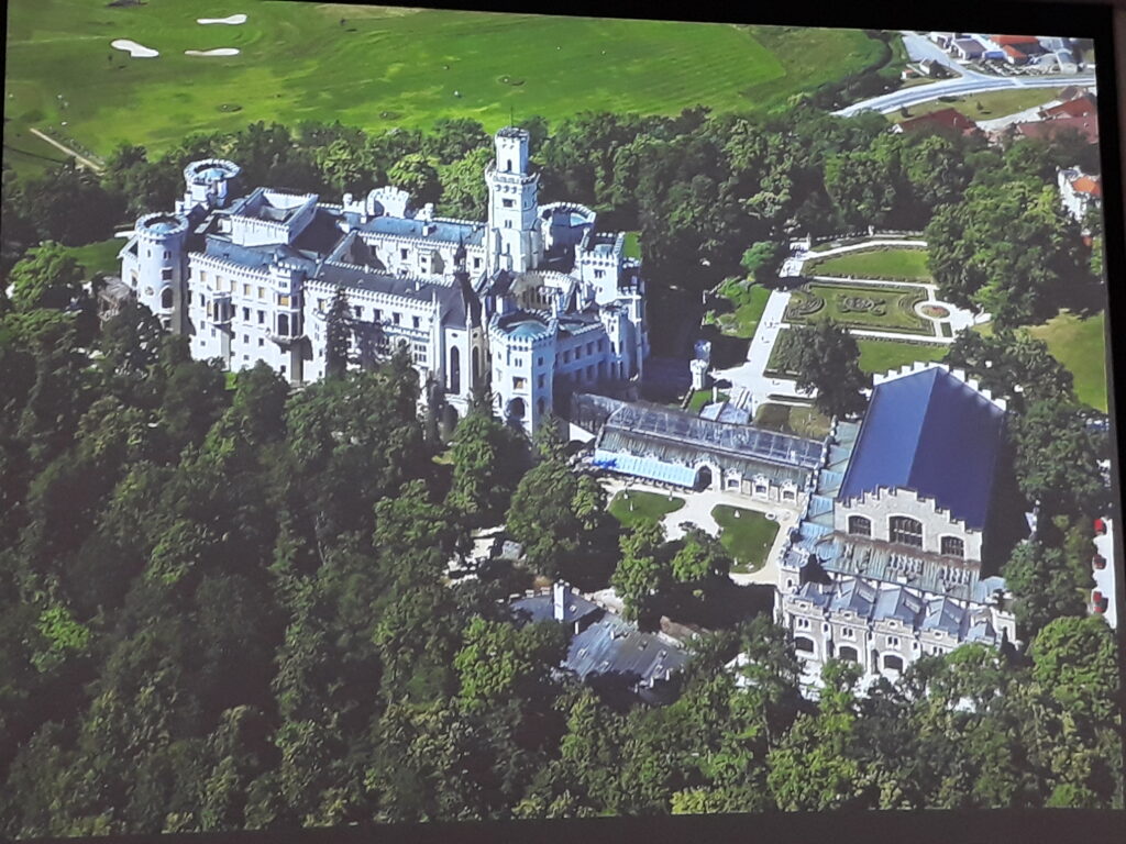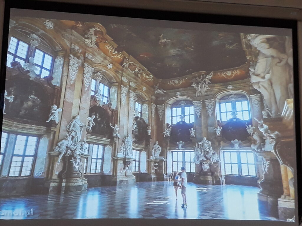 z przepiękną oranżerią. Widzieliśmy też pałace w Venticach, w Lednicy wraz z pięknymi ogrodami i ogromny zamek Krumlov nad Wełtawą i też jeszcze kilka innych równie pięknych obiektów. Oprócz czeskich zabytków pan Krzysztof Myśliński zaprezentował nam też zamki w Polsce, na Śląsku z których najbogatszy i najbardziej charakterystyczny to zamek Książ. Był też zamek w Bolesławcu czy pałac Moszna k/Opola. Zobaczyliśmy również piękną salę „Leopoldinum” Uniwersytetu wrocławskiego.